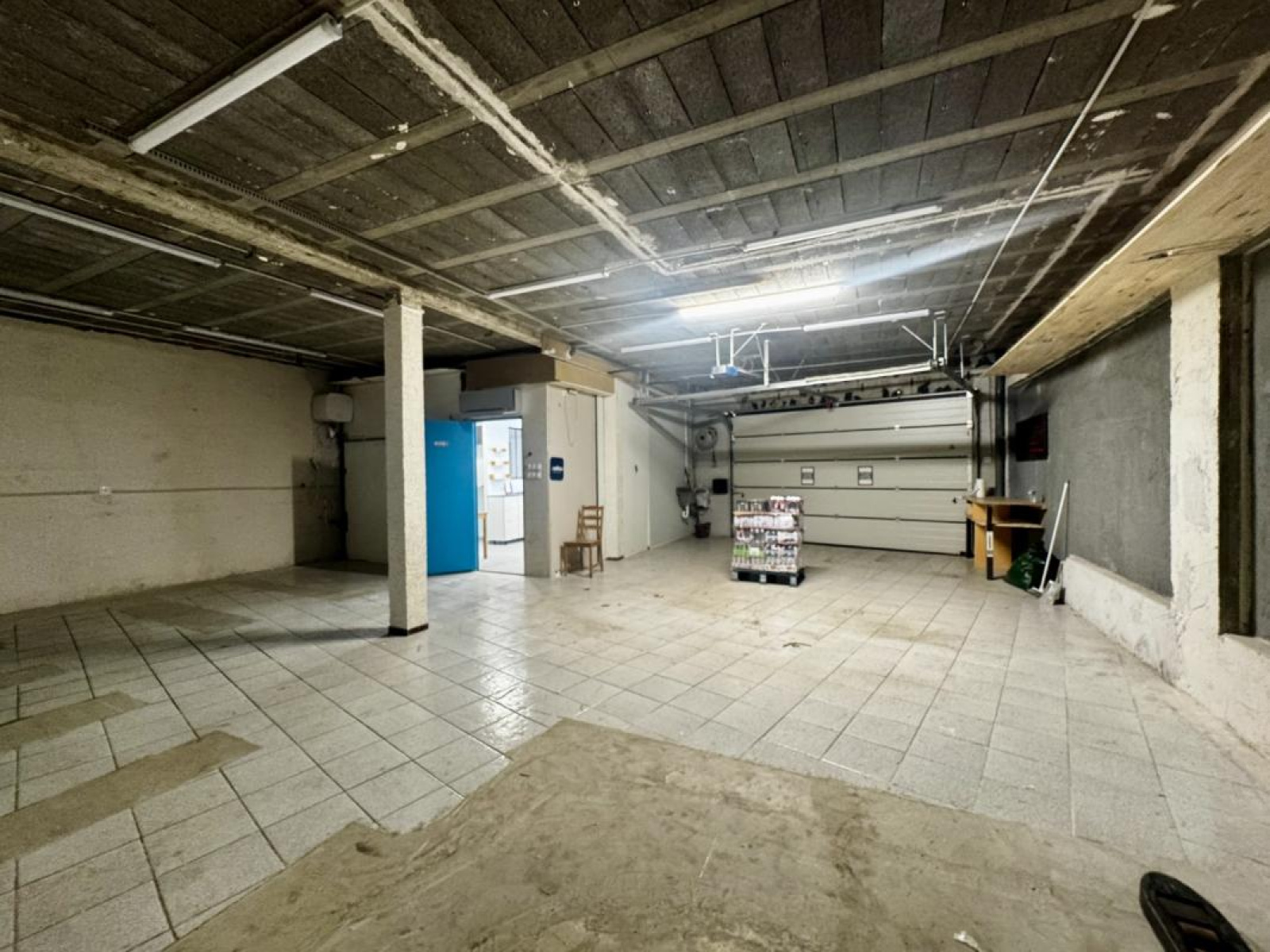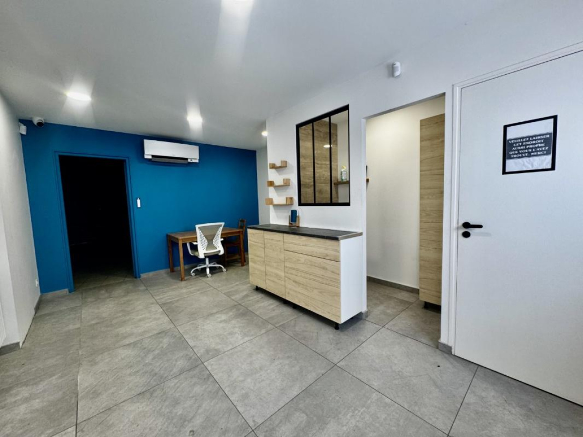 Un espace bureau de 12m² permettant d'accueillir clientèle ou activité administrative, une petite cuisine aménagée pour plus de confort quotidien, un lieu de stockage avec un portail sectionnel permettant les livraisons.